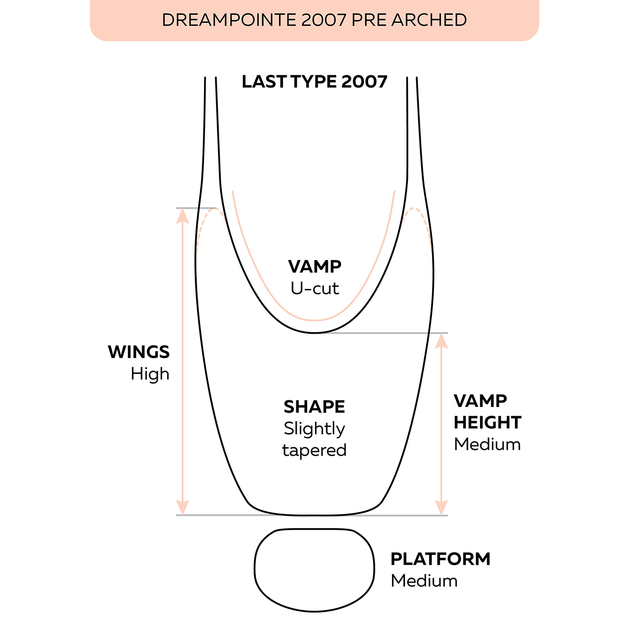 The DreamPointe 2007 Allure Pointe Shoe with Pre-Arched Shank is based on the 2007 last, tailored to meet the anatomical needs of medium-width feet, medium arches, and medium or long toes. This design accommodates approximately 90% of ballerinas, thanks to its tapered and dynamic form.