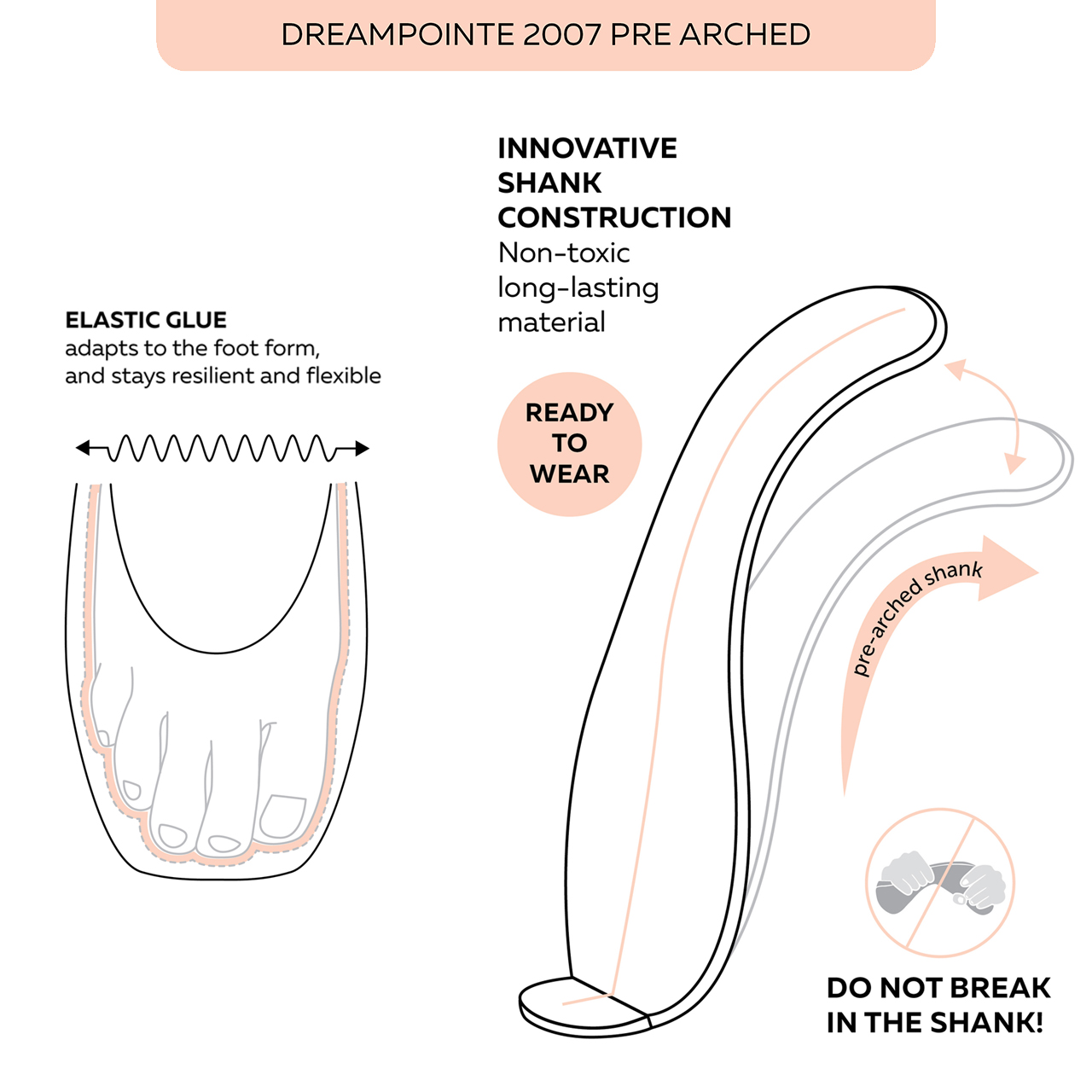 Please note that DreamPointe is Ready-To-Wear: Manipulation of the shank with your hands will break the shank and damage your shoes, making them unwearable. The thermoformable shank will not deteriorate over time, ensuring consistent support throughout the life of your pointe shoes.