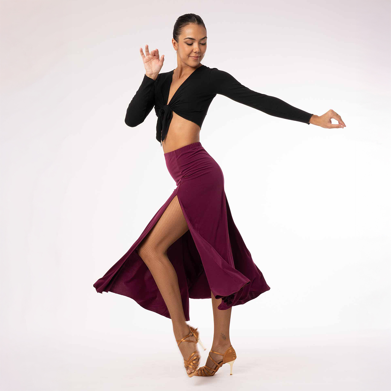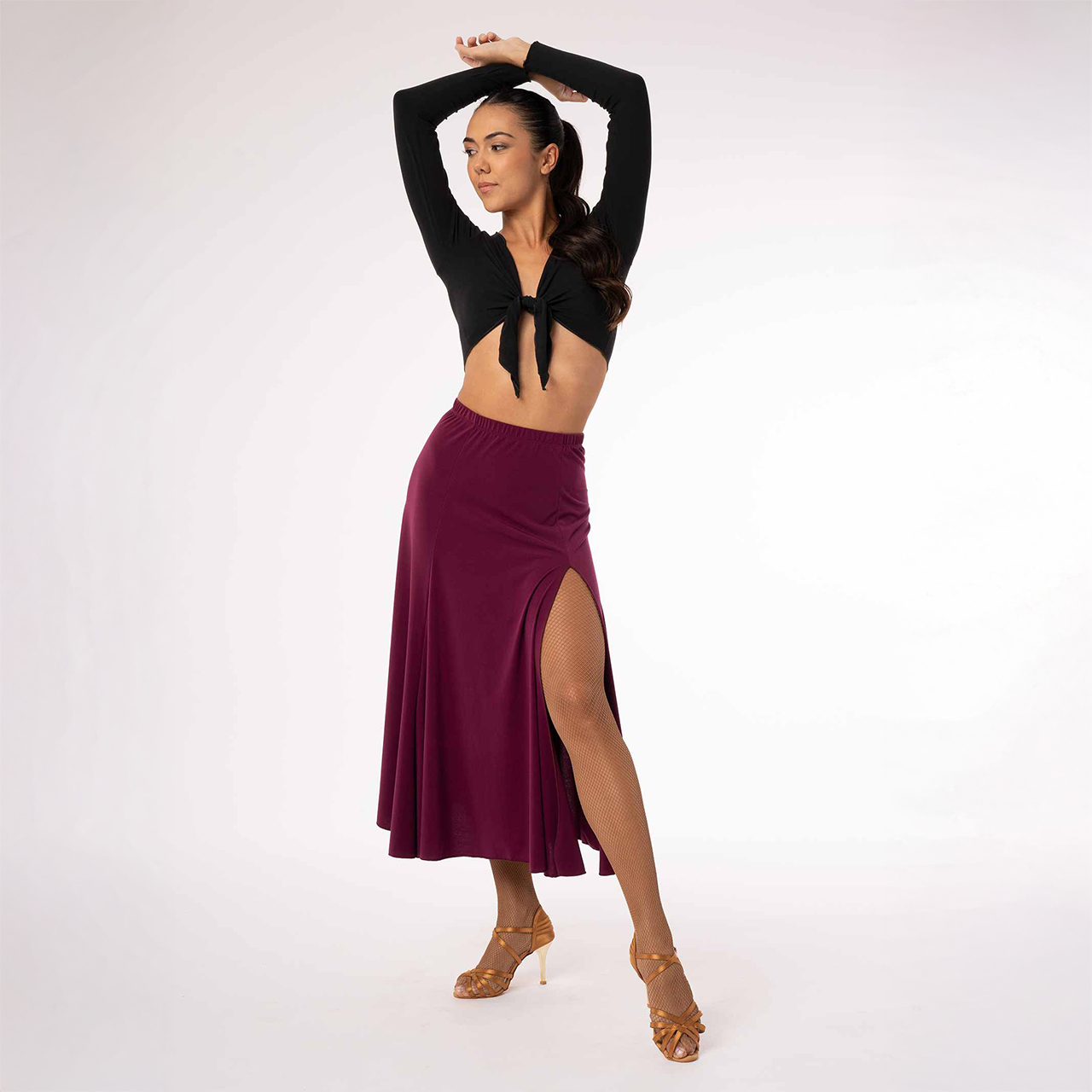 The Intermezzo 7016 Latin Ballroom Practice Skirt is designed for comfortable and stylish movement during your Latin ballroom dance sessions. This mid-length skirt features a side slit that extends to mid-thigh, allowing for freedom of motion and showcasing your legwork. Ethically crafted in Intermezzo's Spanish factory using high-quality European fabrics, this durable and flattering skirt is an essential addition to your ballroom dance wardrobe. Perfect for tango, this skirt's versatile length is suitable for various Latin dance styles.