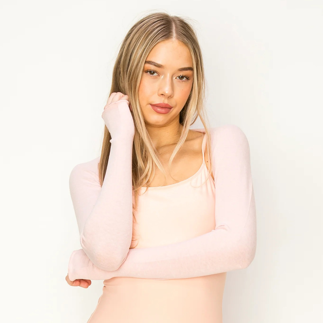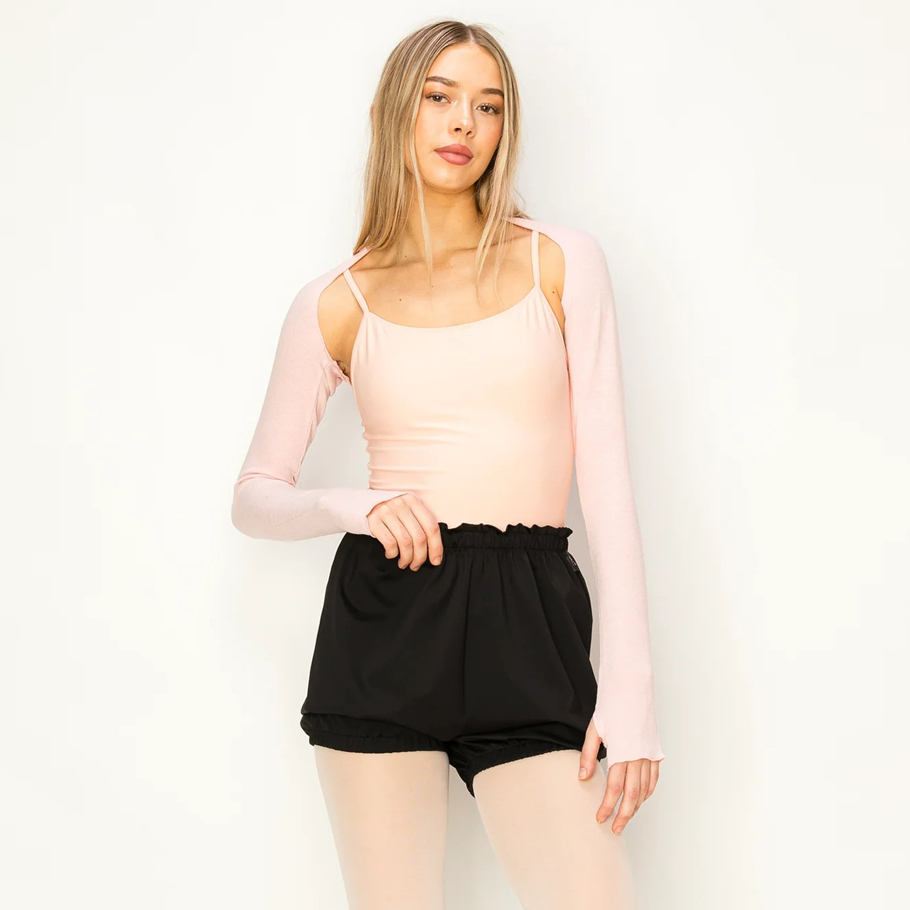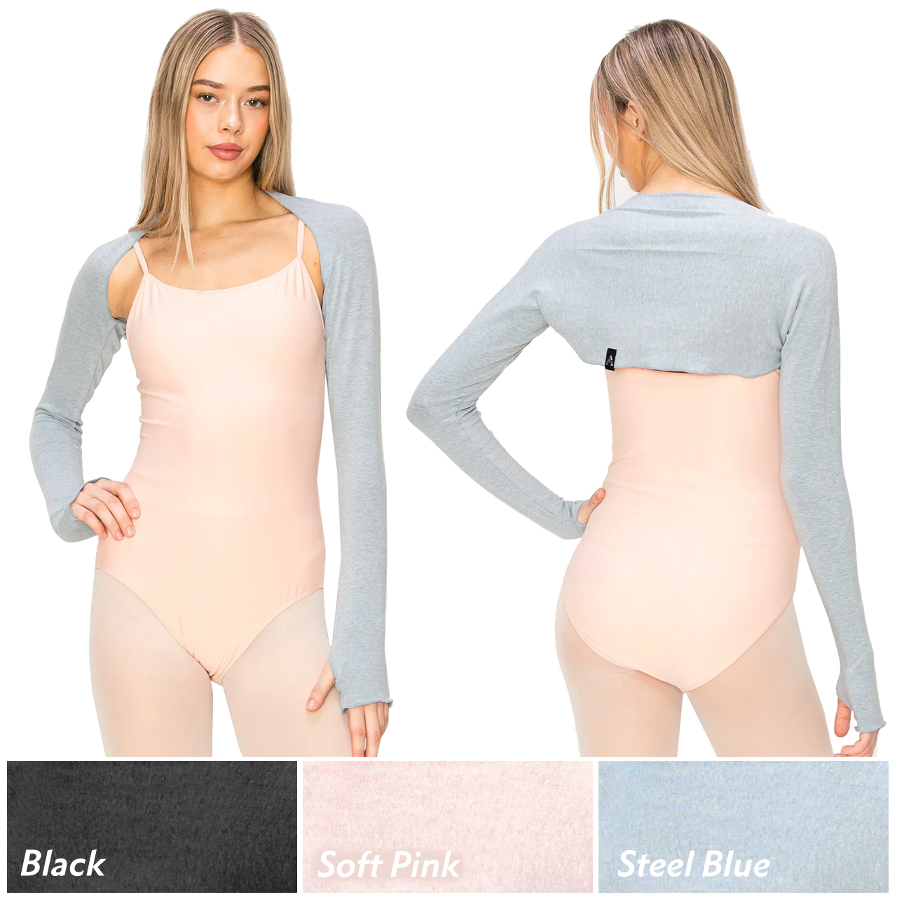 Stay warm, comfortable, and perfectly styled at the barre with the Aluvie AS001 Miu Super Soft Bolero Shrug Warm Up! Crafted from a premium blend of acrylic, cotton, rayon, nylon, angora, and spandex, this luxuriously soft shrug delivers an irresistibly cozy, cottony feel that pampers your arms from the first warm-up to the final cool-down. The skinny, fitted design hugs the arms beautifully without adding bulk, keeping your lines completely visible so teachers can see every movement and correction clearly — no sacrificing technique for warmth here! Convenient thumb holes keep the sleeves securely in place and wrists comfortably warm throughout every class and rehearsal. Lightweight enough to wear all day and soft enough that you'll never want to take it off, the Miu Shrug is a studio essential that tweens and adults alike will absolutely love. One size fits most.