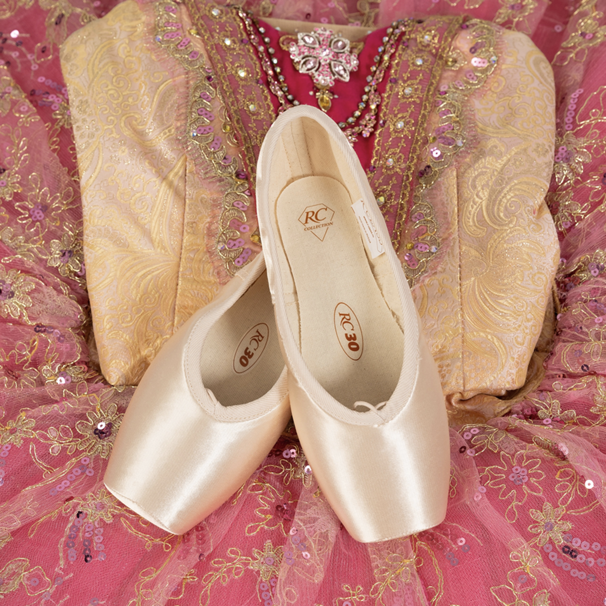The RC30 Fantasia pointe shoe is a part of the RC Signature Collection, featuring hand-made pointe shoes with pleatless technology and durable stitched soles. Pleatless pointe shoes have a lower crown, which allows for shallow foot height and/or lifting higher in the shoe.