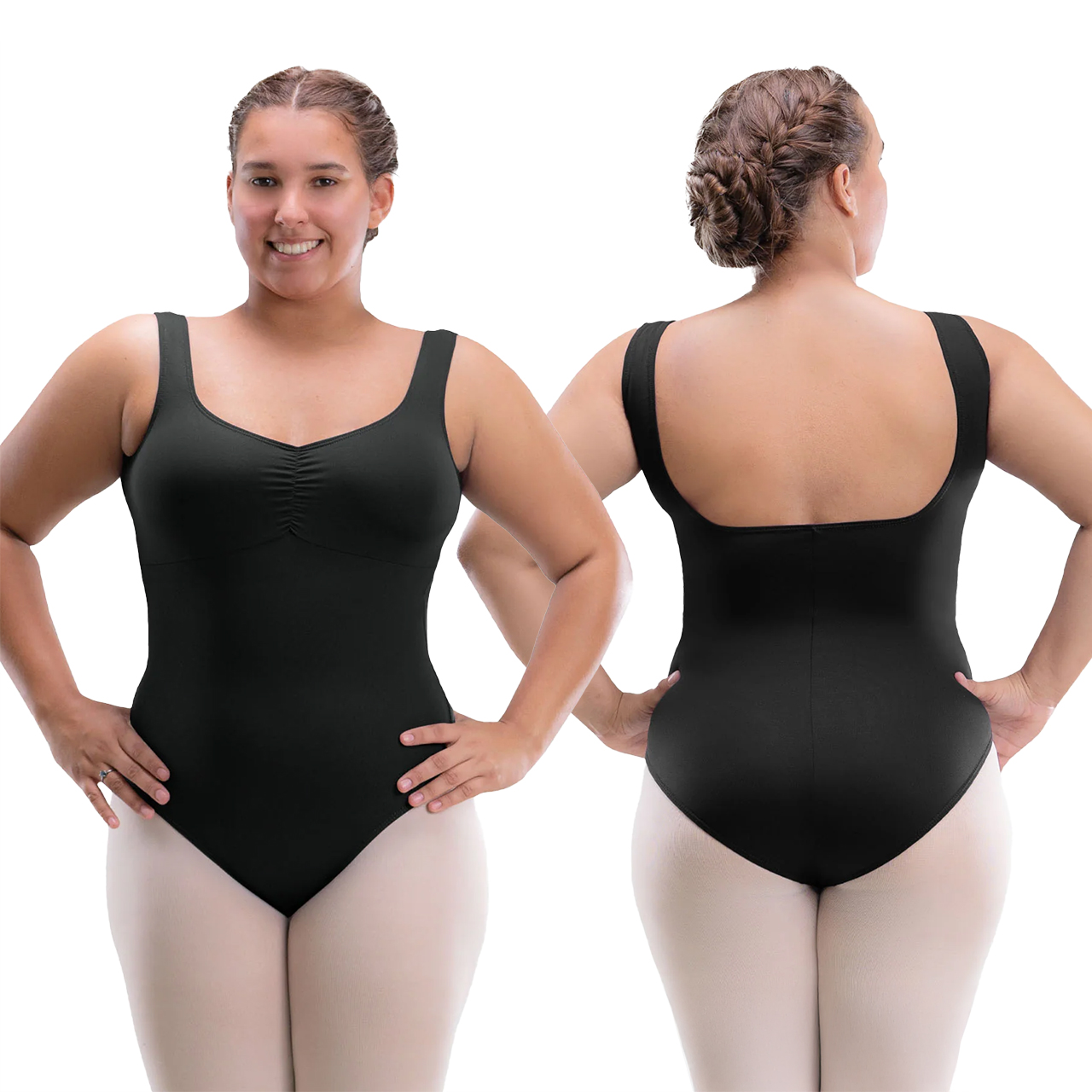 So Danca's Curvy Collection is carefully designed to flatter curvier bodies. That means the pieces are not just larger but cut to work with rounder shapes. Feel like a queen on and off the dance floor in the stunning So Danca Edda Tank Leotard. This elegant leotard features delicate princess seams, a flattering pinch front, and a stylish square scoop back. Designed for comfort and support, it includes a shelf bra lining and is available in extended sizes to flatter every figure.